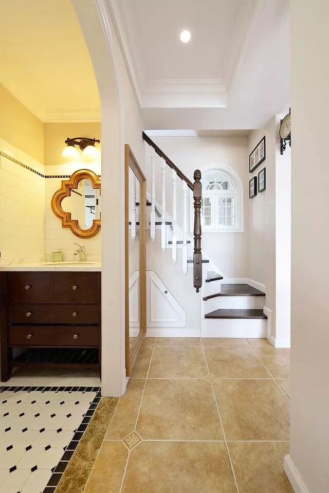楼梯旁的空间做了卫生间,用拱形门隔断,很有美式特点。