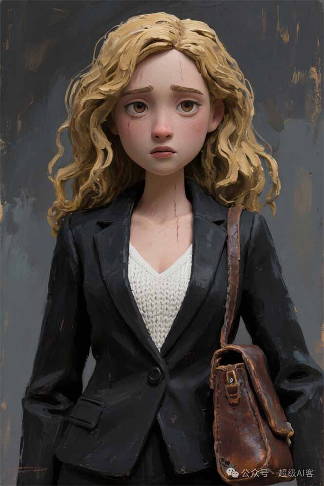 ***她有一张精致的、略显憔悴的脸庞,被她那长长的金色波浪卷发,每一缕发丝都像是用厚涂技法(impasto)精心塑造的,带有清晰的笔触痕迹。她那双杏仁状的大眼睛忧郁地低垂着,小巧而精心雕琢的嘴唇微微张开。她身着一套剪裁利落的黑色西装,西装外套的布料上能看到哑光的、有质感的笔触。西装内搭一件洁白的白色v领毛制吊带,其针织纹理通过精细的油彩凸起巧妙地表现出来。她的一只胳膊上挎着一个牛皮包,包的表面呈现出一种带有磨损感的皮革质地。